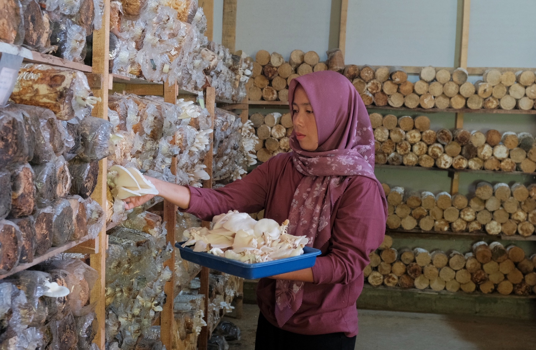 Penulis: Y Thendra BP | Foto: Y Thendra BP Jamur tiram putih (Pleurotus ostreatus) baru panen disortir oleh tangan-tangan kaum ibu. Lalu jenis jamur yang kaya protein dan asam amino