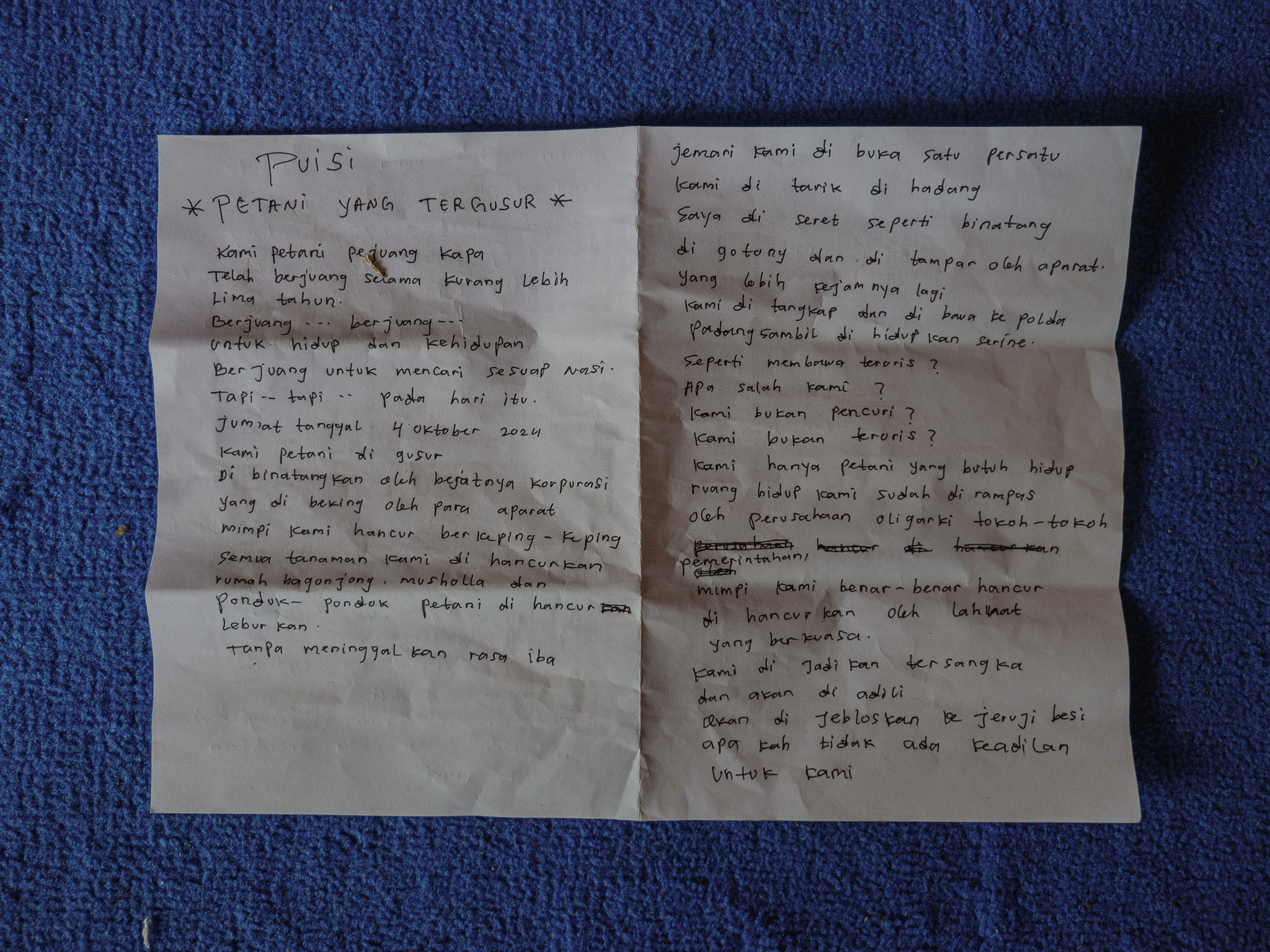 Baris puisi tersebut saya dengar dibacakan langsung oleh Syahmiarti, seorang petani perempuan berusia 43 tahun dari Nagari Kapa, Kabupaten Pasaman Barat. Dia salah satu perempuan yang memperjuangkan lahannya yang dikuasai salah satu perusahaan sawit besar di Sumatera Barat. Lampu panggung hijau menyorot wajahnya dan tangisnya meledak. Namun selepas pembacaan itu dia merasa lega. Sebab menurutnya perjuangan mereka belum selesai dan mereka tetap melawan dengan menanam melon sebagai gerakan ekonomi tanding perlawanan terhadap perusahaan.